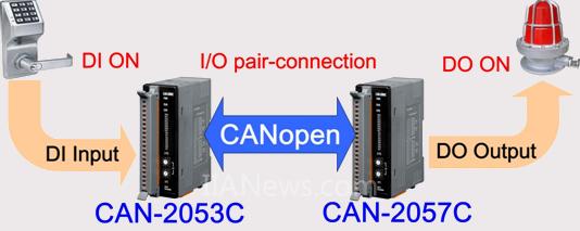 CAN-2053C可和另一CAN-2000C系列的DO模块(例如CAN-2057C)搭配成CANopen的I/O pair-connection网络