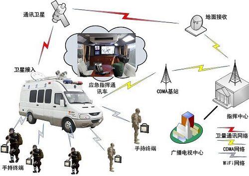 地面指挥中心部署核心的应急指挥调度系统,可通过地面CDMA网无线信道、卫星网络与应急车建立通信信道。应急指挥调度系统具备强大的通信交换能力,为指挥中心与各通信车、现场移动单兵设备、手持终端设备之间提供交换连接服务,并可实现与公共电话网之间的连接;应急指挥调度系统还可以实时处理现场传输过来的视频信息,与地面指挥调度中心形成统一的指挥平台。