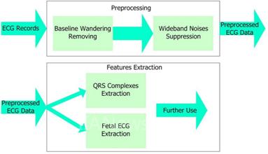 从功能上来说,心电信号的处理可以大致分为两个阶段:预处理和特征提取(如图3所示)。预处理阶段消除和减少原始心电信号中的噪声,而特征提取阶段则从心电信号中提取诊断信息。
