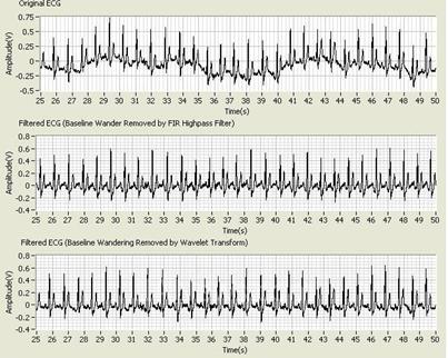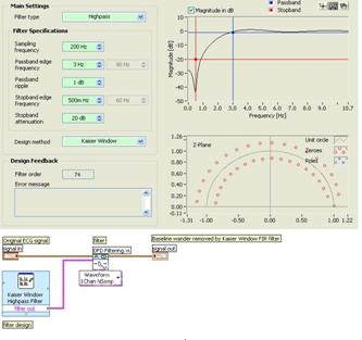 通过LabVIEW图形化和交互式的方法,可以高效地设计和实现有限冲击响应(FIR)或无限冲击响应(IIR)滤波器。例如,用户可以使用Classical Filter Design 设计Kaiser窗FIR高通滤波器消除基准漂移。图4显示了使用高通滤波器消除基准漂移的实例。