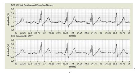 通过小波变换将心电信号分解到各个子带,然后利用阈值或收缩功能调整小波系数,最后重建出消除噪声后的信号。下图显示了通过LabVIEW中非抽样小波变换(UWT),宽带噪声被极大地抑制而心电信号的细节则保持不变。