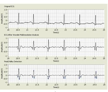因为小波能够借助于多分辨率的优势对带噪声的信号进行主要特征的提取与分析,所以近年来提出了许多基于小波的检测方法。在本文中,LabVIEW高级信号处理工具包中的Multiscale Peak Detection函数被用于检测Q、R和S点。在波峰/波谷检测前,使用Multiresolution Analysis Express函数将心电信号分解为8级的Daubechies6 (db06)小波,然后使用D4和D5子带重建出信号。之所以可以利用D4和D5子带进行重建,是因为几乎所有的QRS细节都处于这两个子带中,这使得QRS检测更为精确。
