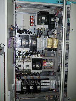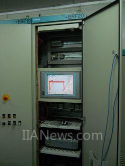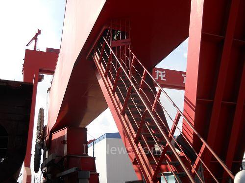 在龙穴造船厂刘工的陪同下,一行人登上了50多米高的龙门吊电控室,走进了这庞然大物的控制中枢。刘工告诉记者,龙穴造船有限公司采用了西门子的很多系统驱动和控制产品,如中高压开关柜、变压器、电机、变频驱动装置、SIMATIC HMI等。船厂的4台600吨龙门吊的电控系统采用了西门子S7系列产品。要控制这样的大型的龙门吊,对于电控产品的要求之高可想而知,然而经过较长时间的运行,西门子的产品在可靠性和节能性方面都有优越的表现。据刘工介绍说,实现龙门吊刚性腿和柔性腿的同步非常重要,这也是当前很对企业面对的最大困难之一。而西门子的产品不仅能很好的满足客户的这一需求,也能够在两辆龙门吊车之间直接通讯,实现2台吊车可同时控制。