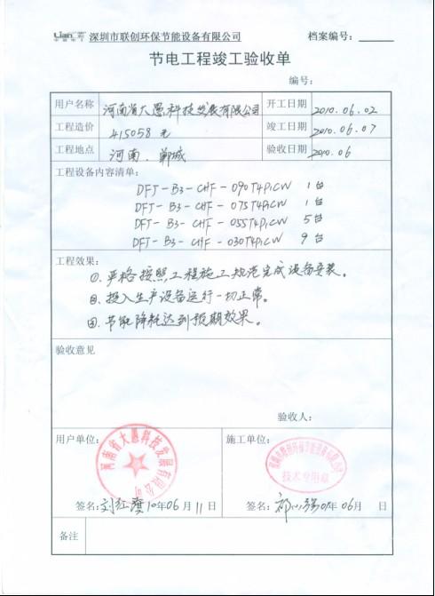 由承担的河南晋开化工集团整体节能改造工程涉及到化工生产线的全部大功率用电设备,包括、、等高低压设备16台。本工程于2010年6月10日安装调试完毕,通过验收节电率分别可达30%——60%之间,该项目投入使用后,每年可为该公司节约电费5000万元人民币。