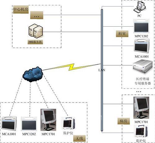 研祥终端智慧医疗产品解决方案由中心机房、无线/3G/有线网络及研祥终端智慧医疗产品及各种医疗仪器构成。移动医疗终端MCA-1001、病床终端MPC1701和各种监护仪器通过无线/3G/有线接入医疗网络平台及各种信息系统,医疗终端专用服务器通过无线/3G/有线网络在各终端设备和中心机房之间传递交换相关资料和数据。这样就构成了一个实用的用于医疗信息系统的物联网。