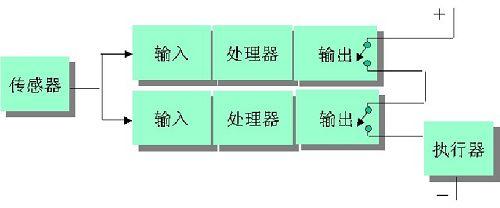 这种结构的输入方式有两种:一种为一个传感器接到两个输入点上(可以使用同一个模块的两个点,也可以使用两个模块的两个点,厂商推荐用户最好采用不同机架上的两个不同模块的两个点);一种为两个传感器或者一个传感器的两个接点接到两个输入点,这样可以进一步提高输入信号的可靠性(传感器冗余)。