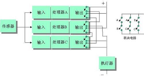 每个CPU 是各自独立地、非同步地运行,并且不共享它们的输入/ 输出数据,从而避免了一个 CPU 的错误数据影响其他 CPU 的数据存储器。每个 CPU 执行相同的应用程序,处理输入数据,然后建立新的输出数据。通过输出模块和现场表决接线,把输出数据传送至输出设备。