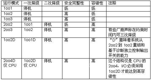 总之,从不同系统结构角度来看安全性和可用性,会使多数用户感到困惑。 下表描述了系统结构对一个中央流程单元或控制器一旦失效发生所带来的影响。在每种情况中,达到的安全完整性和容错性仅代表冗余对安全性和可用性的影响。做为冗余,仅有一个测量值来考虑安全性和可用性是不够的,还要考虑很多其他的因素。