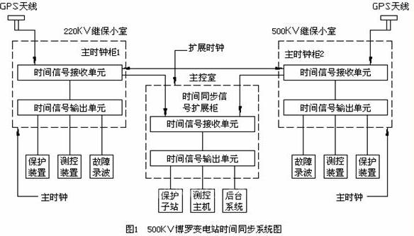 在500kV博罗站,如图1所示,500kV继保小室和220kV继保小室内各设1套主时钟,负责本小室二次设备的对时,包括软对时、硬对时(1PPS、1PPM、差分信号)、编码对时(IRIG-B、DCF77)。保护小室主时钟的时间信号接收单元除了接收本小室的GPS时间信号外,还接收另一小室的GPS时间信号作为备用的标准时间源输人(通过光纤以IRIG-B时码方式输入),两台主时钟之间能够互为备用,当一个小室的时间信号接受单元出现问题时(例如跟踪不到卫星、天线受损等),自动切换到另一小室GPS上,获取标准时间信号,保证本小室对时信号正常输出。另外,在主控室设一套扩展时钟,主时钟和时间扩展装置之间通过光纤连接,时间信号接收单元分别从两台主时钟获取时间信号,互为备用,自动切换,完成对本室设备的对时,扩展装置接受主时钟提供的时间信息,经过扩展向其它装置提供多路输出接口。