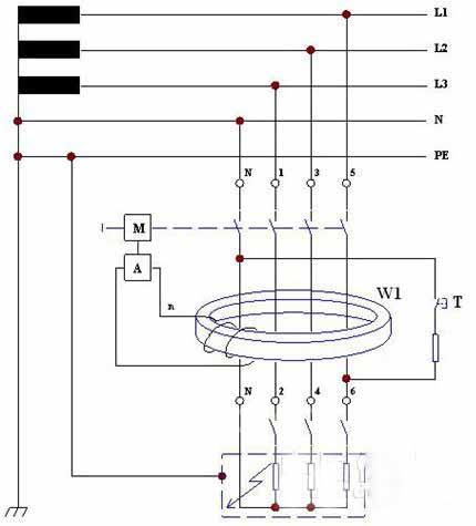 如图,剩余电流保护器对正常的负载电流不予检测,但它能检测出主回路中对保护地线PE的剩余电流(漏电流),这种电流多数是因为用电设备绝缘损坏而产生的。