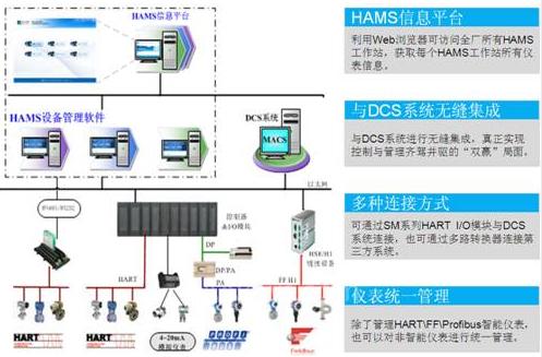 HAMS是和利时公司针对工厂设备资产管理的解决方案,以HART、FF和Profibus协议为基础,以国外先进设备集成技术EDDL(Electronic Device Description language,电子设备描述语言)技术和FDT/ DTM(Field Device Tool/Device Type Manager,现场设备工具/设备类型管理器)技术为技术手段,集数据采集和数据分析于一体,主要用于实现工厂仪表的远程配置与诊断、在线调校、标定管理、预测性维护以及日志记录跟踪等功能。HAMS提供的设备管理与维护功能,使智能设备能够发挥最大效益,减少仪表的损耗并降低维护成本,为用户提供一个快速方便统一的管理平台,使得工厂能够在减少操作、降低维护工作量和减少运营成本的同时,大幅提高工厂设备的可用性、生产能力和产品质量,并可以实现HAMS系统与DCS的无缝集成。