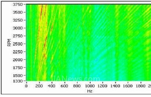 旋转机械的运行一般有两种状态:旋转机械运行在一个恒定转速下。这种状态下,旋转引起的对整个机械结构的振动激励可以被视为有着离散频谱的多个谐波组成激 励信号,相应的结构振动响应信号的频谱也是多个谐波构成的离散谱。如图 1所示。另一种是旋转机械运行在升速或降速过程。这种状态下,旋转引起的振动激励可以被视为通过某个频率范围的宽频带扫频激励信号,相应的结构振动响应信 号的频谱是宽频带响应谱,如图 2所示。