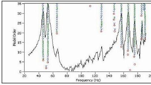 获得旋转机械结构每个测量点的工作状态FRF后,就可以使用频率域模态参数估计方法来提取结构的模态参数。在模态估计环节,采用了ModalVIEW中最小二乘复频域的方法。获得的模态稳定图如图 10所示