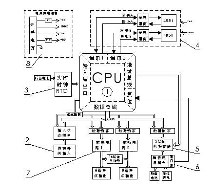 ARTU-J16遥控单元硬件主要包括主CPU芯片、拨码开关设定输入、实时时钟、双路RS485通讯、SOE事件记录存储、看门狗控制、继电器控制及输出、供电电源模块等8部分组成(见图1)。