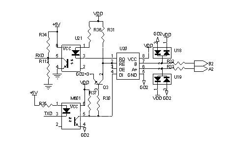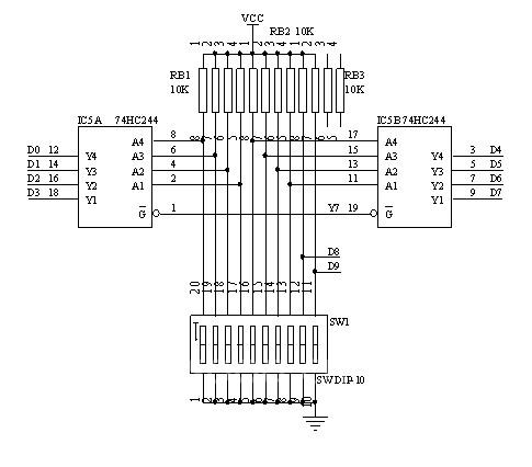 拨码开关提供用户一个简化的人机接口,用于设定RS485通讯中的地址、波特率、数据格式等设定功能,拨码开关(SW1)的10位数据口都接10k电阻上拉到Vcc,电路使用一个74HC244(IC5)数据缓冲器,把拨码开关的状态传送到8位数据总线,剩余两根数据线则直接接到CPU的I/O端口(见图2)。