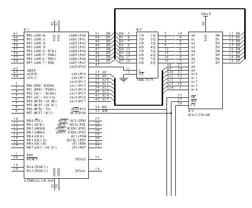 SOE事件记录存储器使用32k低功耗SRAM(IC3)IC61C256AH和后备电源形成一个断电不丢失的数据存储单元,使用数据锁存器74HC373(IC2)和CPU的PC端口组成15位数据地址对IC3进行数据存储操作(见图4)。