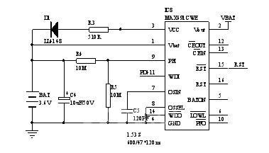 掉电自动保存部分使用MAX691CWE(IC8)作为电源管理,在系统有辅助供电的情况下保证IC3由主电源Vcc供电,当主电源掉电时则自动切换到后备电池供电方式。同时此芯片还兼有看门狗功能,在系统死机的极端情况下及时复位CPU使系统快速恢复至受控状态(见图5)。