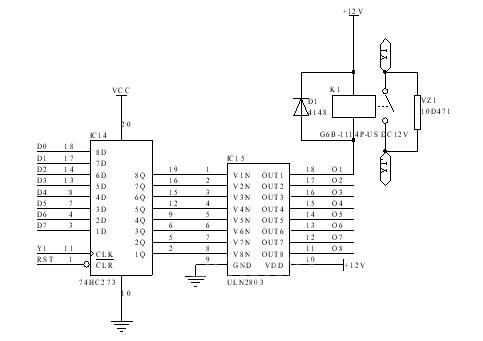 继电器控制输出使用一个74HC273(IC14)锁存需要输出的8路继电器输出状态,再经由ULN2803(IC15)驱动对应的继电器(K1只是16路中的一路),二极管D1可以旁路继电器K1在断开的瞬间所产生的反向电流,而并接在K1输出接点上的压敏电阻VZ1则可以吸收关断后级感性负载所产生的反向电动势,有效延长输出继电器触点的寿命(见图6)。