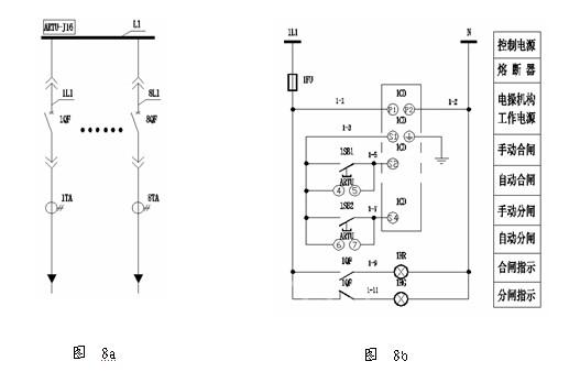 以某配电系统为例,1台ARTU-J16控制8路低压馈线,CM1断路器配电动机操作机构,一次方案见图8(a),控制方式见图8(b)。启停按钮现场手动控制各回路断路器的合、分闸,遥控单元通过通讯接口集中控制8路断路器的工作状态,实现断路器就地与远程两地控制的工作模式。
