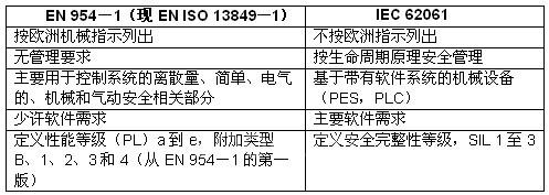 IEC 62061 标准同样把注意力集中于机械设备安全功能的量化,按照每小时的失效概率(PFH)来决定安全完整性等级(SIL)。做为设备提供商通常没有可靠性数据用于PFH计算,所以在短期内证实是困难的。不像原始的和升级的 EN 954-1版本,IEC 62061针对可编程系统,因此也包括相当多的软件和管理需求。