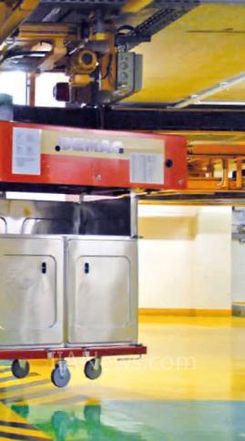因此,UKD 运用一个自动运输输送机(ACC)系统,该系统由带滚轮儿的1,100 个不锈钢容器组成。工作人员将容器从病房推向ACC。在那里,系统使用手推车传送带自动地将这些容器送达它们的目的地。根据不同的需求,容器分为6 种类型。它们从厨房,药房,洗衣店,中央存储或消毒中心运送粮食,医药,衣物,设备,或垃圾到不同的大楼站点。在中央大门,将容器放入系统并通过一个控制面板将容器发往不同的目的地。他们还指定回程的目的地以便药用的容器回到药房而不是回到洗衣店。