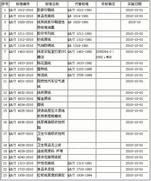近日,中华人民共和国工业和信息化部发布公告[工科〔2010〕96号],批准发布110项轻工行业标准,其中涉及造纸行业标准23项,本批标准将于2010年10月1日起开始实施,具体标准编号与标准名称见下表。
