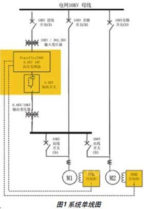 (CB2,CB3)、10kV进线开关柜(CB1)、10kV出线开关柜(CB4,CB5)、10kV输出变压器旁路开关柜(CB6)高压电动机(M1, M2)。