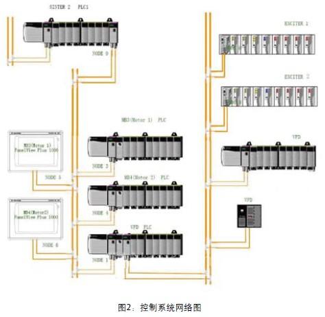 ControlNet网络,这个网络通过烧结主系统的PLC2远程I/O站与烧结主系统L1网络连接.变频器(VFD)PLC有一个ControlNet I/O网络,两个Point I/O分别控制MB3(Motor1)、MB4(Motor2)的励磁盘,1756 -A10框架及20-COMM-C完成变频器本体的控制及数据交换,本地框架主要是高压盘等外围接口状态采集及控制。