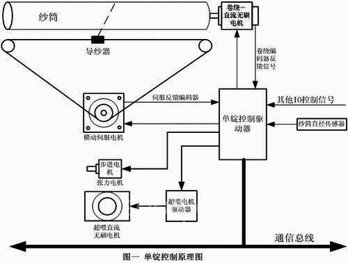 以单锭控制为例,系统控制方案原理如图一所示,横动电机轴连接一个钢丝轮,通过钢丝轮的正反旋转驱动紧固在钢丝上导纱器左右移动,实现纱线的横动排线运动;卷绕电机直接驱动纱筒旋转,实现纱线的卷绕运动,上述横动和卷绕两个运动合成后即表现为纱线以螺旋线的形状来回卷绕在纱筒表面。张力补偿电机和超喂电机则主要用于控制纱线卷绕过程中的张力。