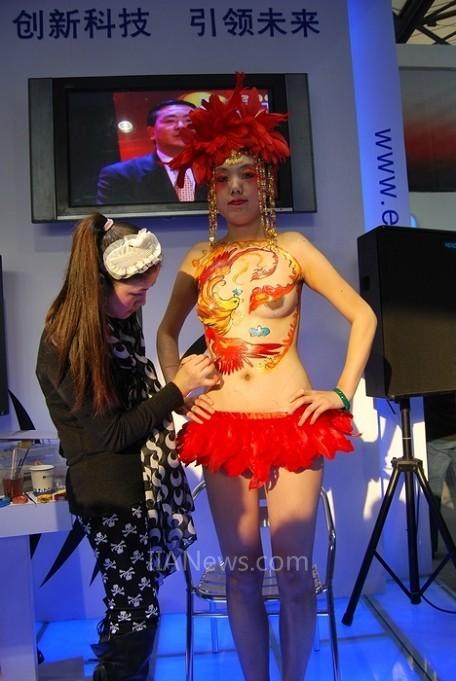 展位现场,研祥集团请来人体彩绘大师现场作画,以这种前卫、新兴的艺术形式寓意研祥引领特种计算机行业不断创新发展的企业文化理念。然而如果说人体彩绘艺术让参观者大开眼界的话,研祥自主研发制造的特种计算机JNB-1401淋水试验和JMC-1102水下实验则更是让人叹为观止了。