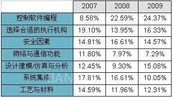 2007年,2008年和2009年,调查结果中用户在进行机械设备设计时,对控制软件编程的关注程度分别为8.58%,22.59%和24.37%,成逐年递增的趋势。这与很多自动化厂商的思路也颇为相似:在硬件竞争激烈的环境下厂商希望通过提高软件的优势来获得更大的竞争力。现在OEM用户传统的重视硬件轻视软件的观念也在逐渐改变,随着生产的规模不断提高,OEM厂商也开始考虑采用了先进的自动化控制产品,而编程问题则是最令OEM用户困扰的。