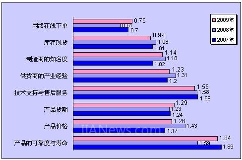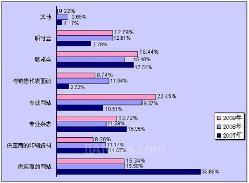 用户通过何种途径了解工业自动化产品信息及技术信息,对于产品供应商来说非常的重要。由传统的展览会,杂志到网络媒体,在线展厅,现在用户拥有了更多的选择。由图2我们可以看到,2007年相对于其他方式,近三分之一用户的选择从供应商的网站获取信息,而2008,2009年,这一数字降至15%左右,登录供应商的网站了解信息已经不在再是用户的首选。