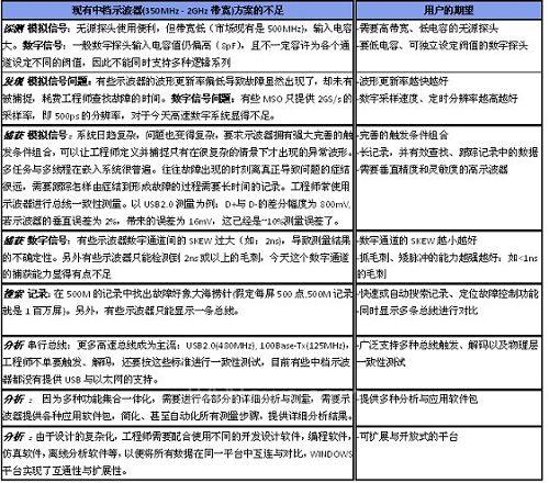 下表分析了现有中档示波器方案对于各个调试阶段的不足即市场空白之处。泰克在深入研究这些市场空白之处和用户细分需求之后,推出了全新的MSO/DPO5000系列及突破性的配套探头,全面覆盖和满足下述用户的期望。