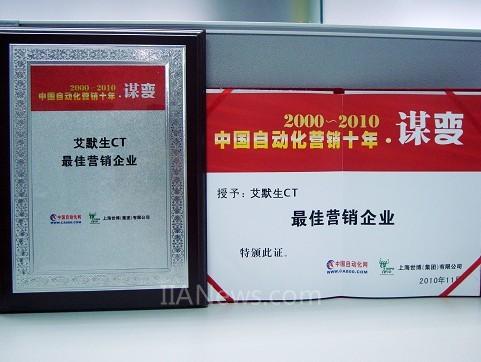 11月10日晚,中国自动化营销十年(2000~2010)评选颁奖典礼在上海永达国际大厦隆重举行。这次活动是由中国自动化网联合中国工博会、品牌中国联盟以及业内多家权威组织倾力打造的工控营销盛会。艾默生CT(CONTROL TECHNIQUES)在此活动中荣获“最佳营销企业”奖。