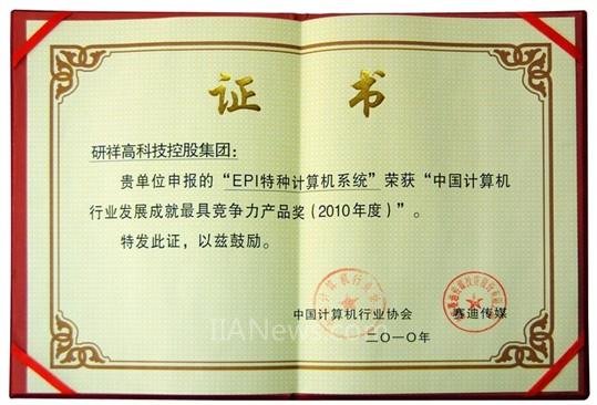 2010年12月16日,旨在表彰2009至2010年度中国计算机行业具有突出贡献的企业、人物、产品、方案和案例的“首届中国计算机行业发展成就奖”尘埃落定。来自全国计算机行业不同领域的优秀企业纷纷参与角逐,研祥EVOC-EPX从众多同类产品中脱颖而出,一举摘取“最具竞争力产品奖”,为行业提供了更具价值的解决方案,标示了行业发展的新风向。