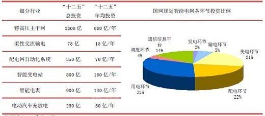 至于具体受益产品,中金公司按未来市场容量测算如下:智能电表(71亿~90亿)、储能电池(年均45亿~60亿市场)、智能变电站(40亿~45亿)、柔性输电(29亿~41亿)、电动汽车充电柜(26亿~30亿)、配电自动化(18亿~20亿)、智能调度(18亿~20亿)和变压器在线监测装置(10亿~12亿)。