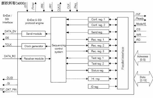 海德汉的合作伙伴MAZet公司针对Xilinx公司的Virtex和Spartan系列及Altera公司的Acex和Cyclone系列提供了EnDat协议的软件宏,根据客户需求,MAZet公司还可以提供定制软核。该软核实现了EnDat接口的所有功能,用户可通过6位地址线和16位数据线与微控制器进行8位或16位的数据传输。下面是FPGA的模块图和电路设计。
