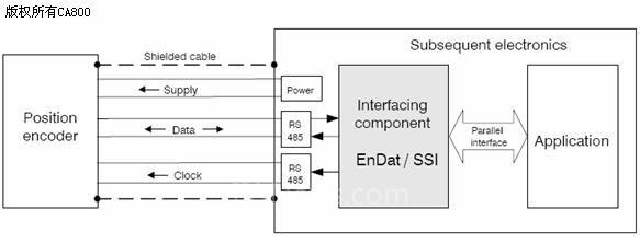 通过遵循RS 一485 (差分信号)标准的收发元件,在后续电子设备发出的同步时钟激励下,数据(位置值和参数)可以在编码器和后续电子设备之间双向传输。
