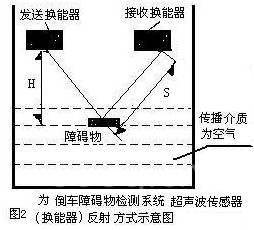 倒车捡测障碍糸统超声换能器的工作方式为反射式,,即发送传感器换能器发射40KHz频率的超声波,迂到障碍后反射被接收传感器的换能器接收并转换成电信号,见图2所示. 其传播介质为空气.