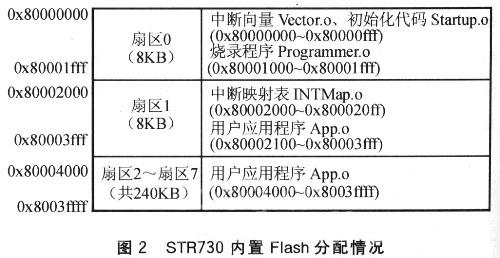 STR730是意法半导体生产的基于ARM7TDMI的微控制器芯片,内置16 KB RAM(0xa0000000~Oxa0003fff)和256 KB Flash(Ox80000000~Ox8003ffff)。内置256 KB Flash的分配情况如图2所示。按照图2中存储器的分配编写Scatter文件,在生成可执行文件时链接器会根据Scatter文件的内容把相关代码段定位到特定的地址上。该例中,程序从Flash启动,且没有使用存储器重映射,因此中断向量必须定位到Flash的起始位置。