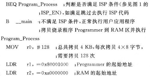 笔者把起到烧录Flash作用的程序单独作为一个工程编译、链接,生成.bin文件;然后把.bin文件转化成一个unsigned char型的数组,并把该数组放在一个单独的文件Programmet.c中;最后利用Scatter文件把Programmer.o定位在固定的地址空间(0x80001000~Ox80001fff,如图2所示)。这样一来,就可以编写汇编程序,把烧录程序Pro—grammer.o拷贝到RAM中,并让PC指针跳转到RAM中执行烧录。由于STR730没有外部Flash,要烧录Flash程序必须在RAM中运行,所以拷贝Programmer.o到RAM中是必需的。以下代码摘取自Startup.s。