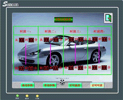 参数设置主要分为通用参数,常用参数,定时温度以及定时时段几个画面。通过这几个参数设置画面,可把各个时间段的温度以及每个时间段的轮换时间传送到PLC自动控制各个时间段的温度变化。下图为定时时段参数设置画面: