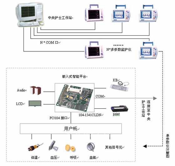 我们以多参数监护仪为例,来看一看“EVOC”嵌入式智能平台在医疗仪器行业的应用。系统一般由多台监护仪和一台中央护士工作站组成,监护仪采用“EVOC”104-1541CLDN型全功能嵌入式工业主板为核心操作平台。该主板仅有手掌的一半大小,板上集成了超低功耗的 NS GX 300MHz CPU处理芯片、 SDRAM、CRT/LCD控制、10/100Mbps网络接口、Compact Flash、IDE、 FDD、两串一并、二个USB、一个115Kbps IrDA红外接口、1~255秒可编程看门狗定时器、PS2 键盘和鼠标,支持目前国内医疗行业最通用的PC/104接口,系统通过该接口扩展的用户板完成包括血压、血氧、体温、呼吸等一系列传感探测器的信号采集,进行实时处理,最后结果可经由多种形式输出。目前该平台支持高精度LCD和VGA两种显示模式,在板视频最大分辨率可达1024*768,支持通用的热敏打印接口,并可通过标准串口与中央护士工作站相互通讯。在平台操作系统的选择方面,我们给予客户更多的自由度,打破了传统多参数仪仅支持单一DOS操作系统的局限,以提供更加灵活广泛的应用模式。
