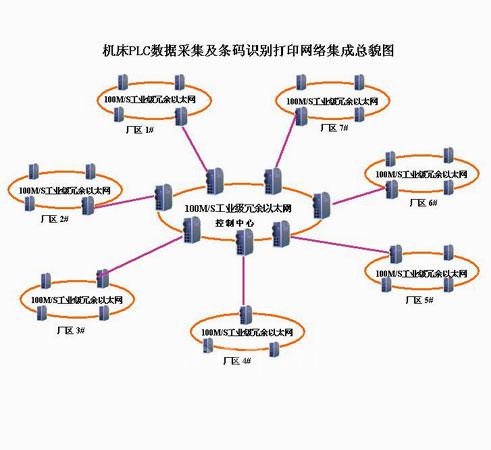机床plc数据采集及条码识别打印网络作为多种业务的传输与交换平台,承担着数据采集、自动控制及其它数据业务信号的汇接和传输任务。从拓扑结构上,整个网路是环型结构互连的准星型网络结构,如图所示。其中,控制中心是由七台kien6000-2s组成的冗余环网,作为网络的核心层;分别采用单模光缆与七个厂区各骨干节点相连接;使用双光纤备份链路,每个厂区都有一个kien 6000-2s和16个kien 1000–8tx组成的100m/s 冗余工业环网,使用双绞线连接成环。