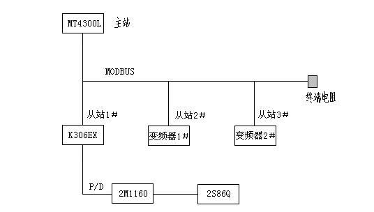 由HMI作为主站,通过MODBUS总线连接三个从站(1个PLC、2个变频器)。PLC的高速脉冲输出功能实现对步进驱动器的控制。 其中通过HMI的两个RS485/RS232通讯口,分别与PLC和变频器通讯,分担了PLC实时通讯的负担,网络结构非常简洁。