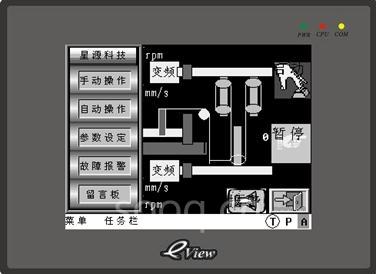 系统在开机时,自动回原点,通过HMI实现系统参数设定、手动操作、自动操作、查看故障报警列表,同时还增加了留言板的功能。除外,通过HMI实现实时监控系统的运行状态以及升降领板的动程的功能。
