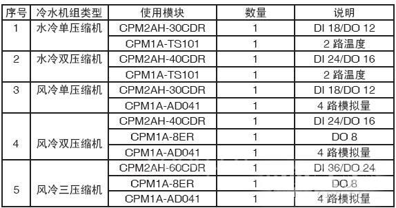 随着技术的进步,由可编程序控制器(简称PLC)组成的自动控制系统在很多行业和领域都得到了广泛的应用,制冷空调行业也不例外。PLC和工业人机界面(HMI)被大量地 用于冷水机组上,例如在吸收式冷水机组上,OMRON的 C200Hα、CS1、CJ1 系列 PLC就以 其优异的性能(运算功能、网络通讯功能、开放的容易使用的通讯协议等)获得了企业和 用户的赞同而得到了广泛的使用。它的网络功能让企业能在自己的服务中心足不出户就可 以监视在全球各地的用户所使用的机组的运行全部状态和数据,帮助客户解决运行中碰到 的问题,提醒客户维护和保养机器,以及帮客户重新恢复机组的控制程序和设定机组运行 参数等等。这大大提高了服务的质量和效率,也为企业节省了大量的开支。但是由于成本 的原因,这些系列的PLC 无法在其他冷水机组如风冷冷水机组、水冷螺杆机、活塞机等产 品上取得应用,为此OMRON 推出了另一款机型CPM2AH,这种机器扩充能力强,性能价格比高,非常适合在水冷和风冷冷水机组中使用。 控制系统的配置方案 CPM2AH 系列PLC 是一款在小机壳内汇聚了先进的功能和优异的表现的产品。其基本单 元有 20、30、40、60 点四种,包含了数字量输入和高速脉冲输入、继电器输出功能,根据 系统开发的需要,可以增加扩展模块,扩展的模块包括开关量输入输出模块,Pt100 温度 输入模块(TS101/TS102),电流电压输入模块(AD041)和模拟量输出模块(DA041)。在通 讯功能上可以: (1)通过Host link 连接到计算机系统; (2)通过1:1 Link 与OMRON其他系列的PLC进行通讯; (3)通过Compobus/S 和Device Net进行远程模块扩展,从而实现集散型控制。 这些功能可以很好地满足机组的控制要求。满足水冷和风冷冷水机组配置要求的控制系统构成见下表: