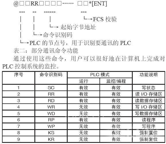 计算机监控 CPM2AH系统可以提供RS232 和RS422 通讯接口,用户计算机可以根据实际情况直接与PLC相联,构筑自己的计算机监控系统,也可以通过调制解调器实现远程监控。在通讯协 议上,OMRON的PLC产品采用统一开放的通讯协议,便于用户开发自己的监控软件。通讯 协议主要有运行状态控制,存储区读写等功能。通讯协议格式为: