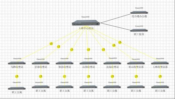 办公网络采用24台Omate6000以太网交换机,先由网通提供光纤专线连接路由器,路由器再通过SDH通信系统连接Omate6000以太网交换机到各个办公大楼及下边各个收费站办公室、职工公寓。