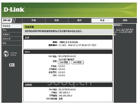 (7)上述步骤完成后,通过PC1登录一下互联网,如果成功,则表明网络调试成功,此时再次进入D-LINK路由器操作,进入“状态”选项,如果连接成功,在WAN一栏中会显示DHCP客户端连接,且“IP地址”、“子网掩码”等均会有所显示,请记下此IP地址,该IP为电信运营部门分配给ADSL的IP地址。比如为。如图5所示。